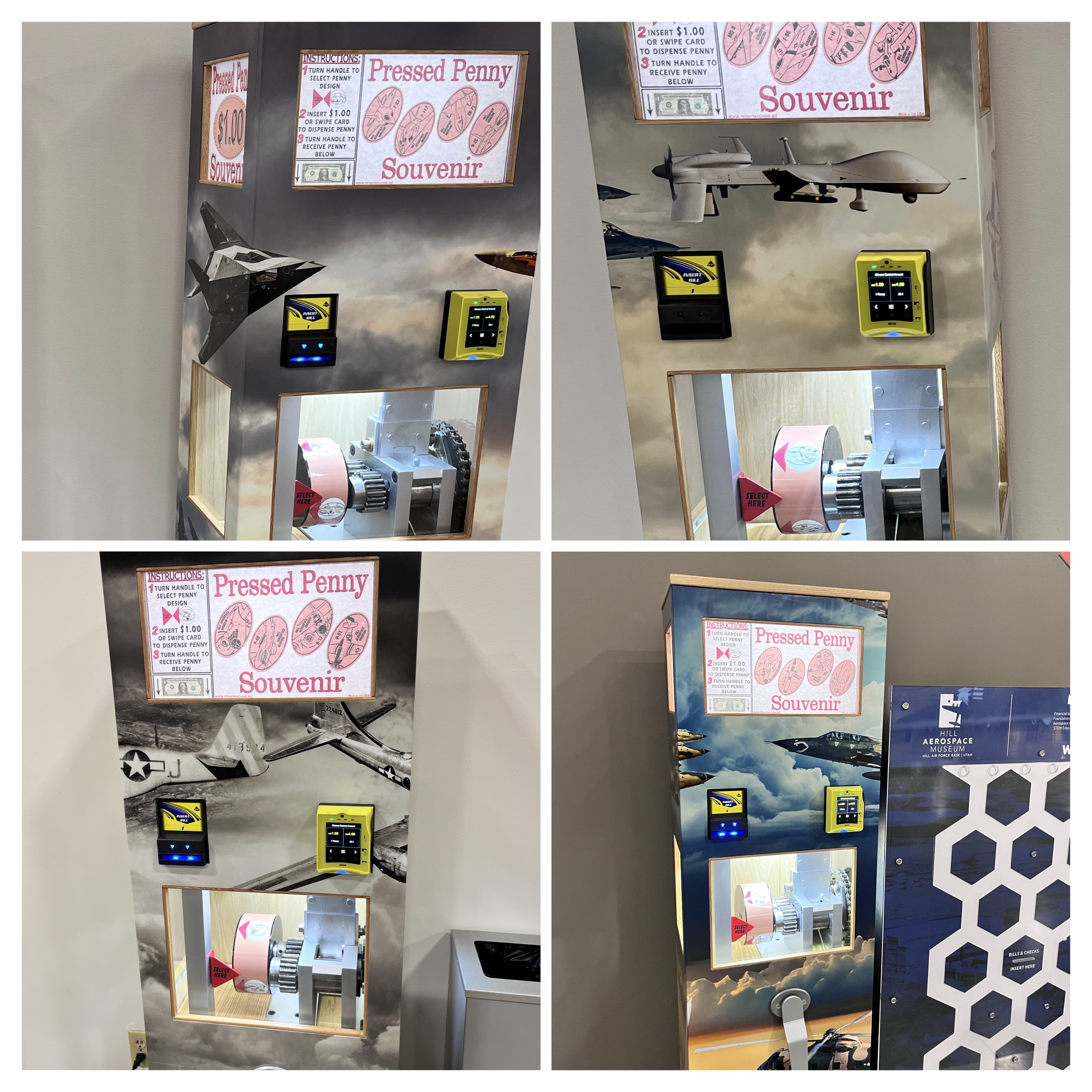 All machines are $1 per coin and you do not provide the penny. You can pay with bills or credit card. If you pay for all 4 designs at once don't forget to crank for all of them.